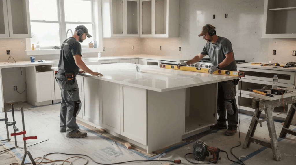 A typical countertop installation project takes 1-3 days for templating, 1-3 weeks for fabrication depending on material and shop workload, and 1-2 days on-site for the installation process. High-rise buildings, custom details, and complex layouts add time. Coordinate appliance delivery, plumbing, and backsplash work around your confirmed install date to keep your kitchen remodel on schedule.